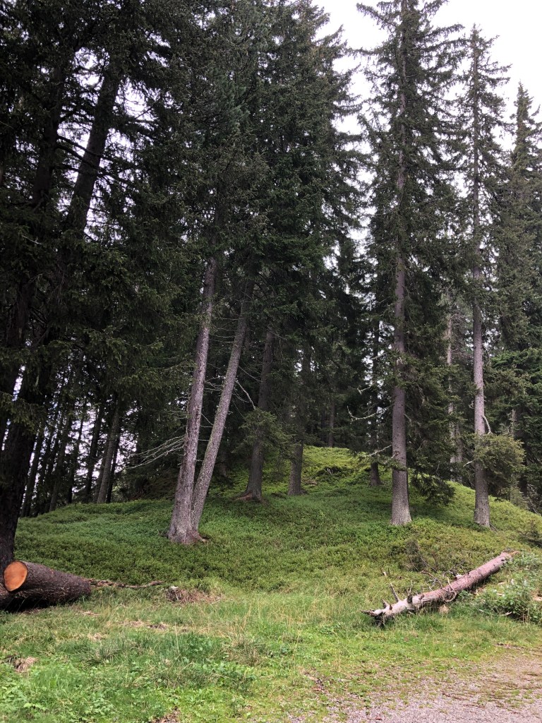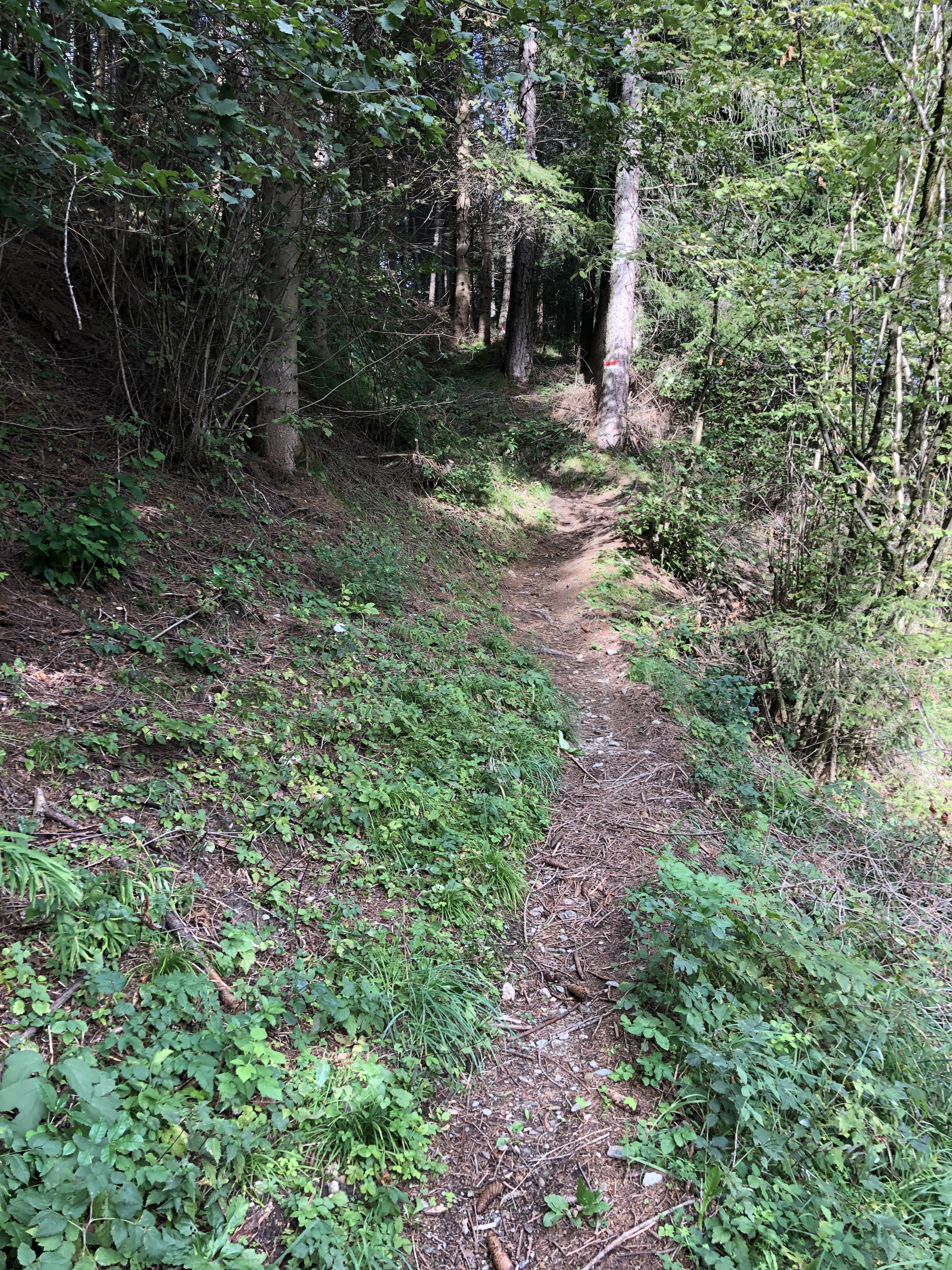 Nach einigen hundert Metern kann ich die Straße verlassen und gehe eine ganze Weile, immer wieder auch steilere Anstiege durch einen Fichtenwald.