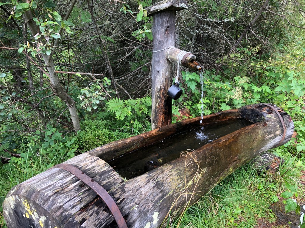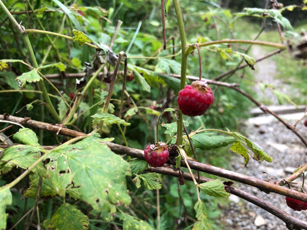 Wasser wird am Wegesrand angeboten und auch Himbeeren wachsen hier oben.