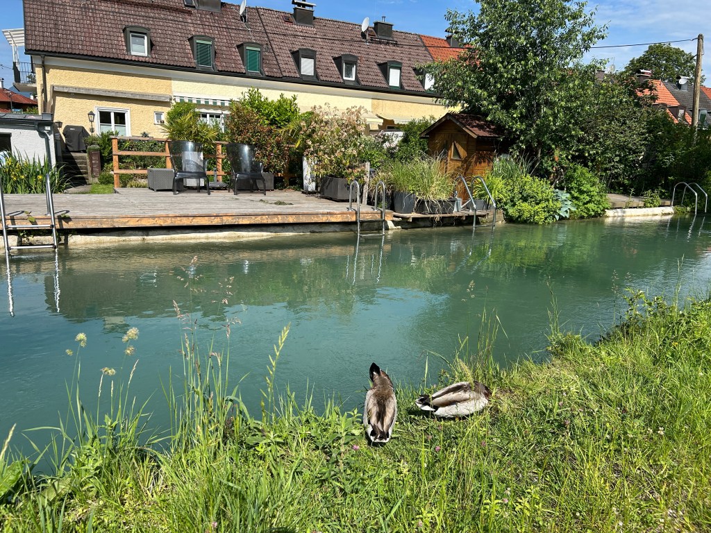 In einigen Gärten sind Pool-Leitern an den Terrassen angebracht. Super Möglichkeit zum Planschen und Abkühlen. (Bergwasser 🥶) Und die Strömung ist auch nicht ohne…