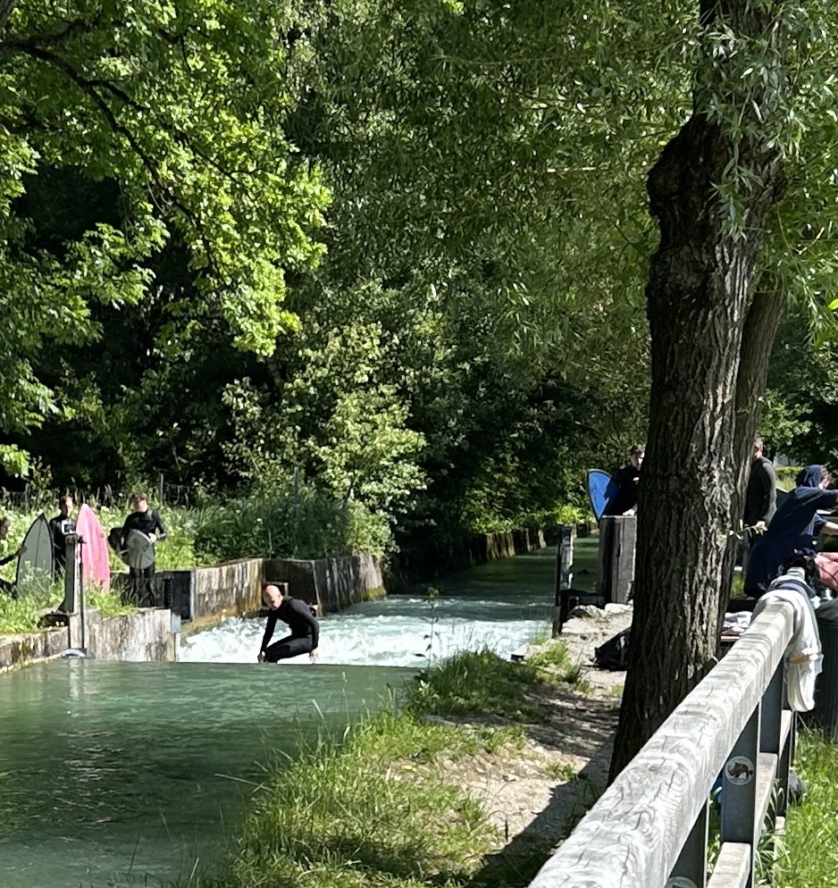 An einer kleinen Stufe tümmeln sich diverse Leute zum Wellenreiten…