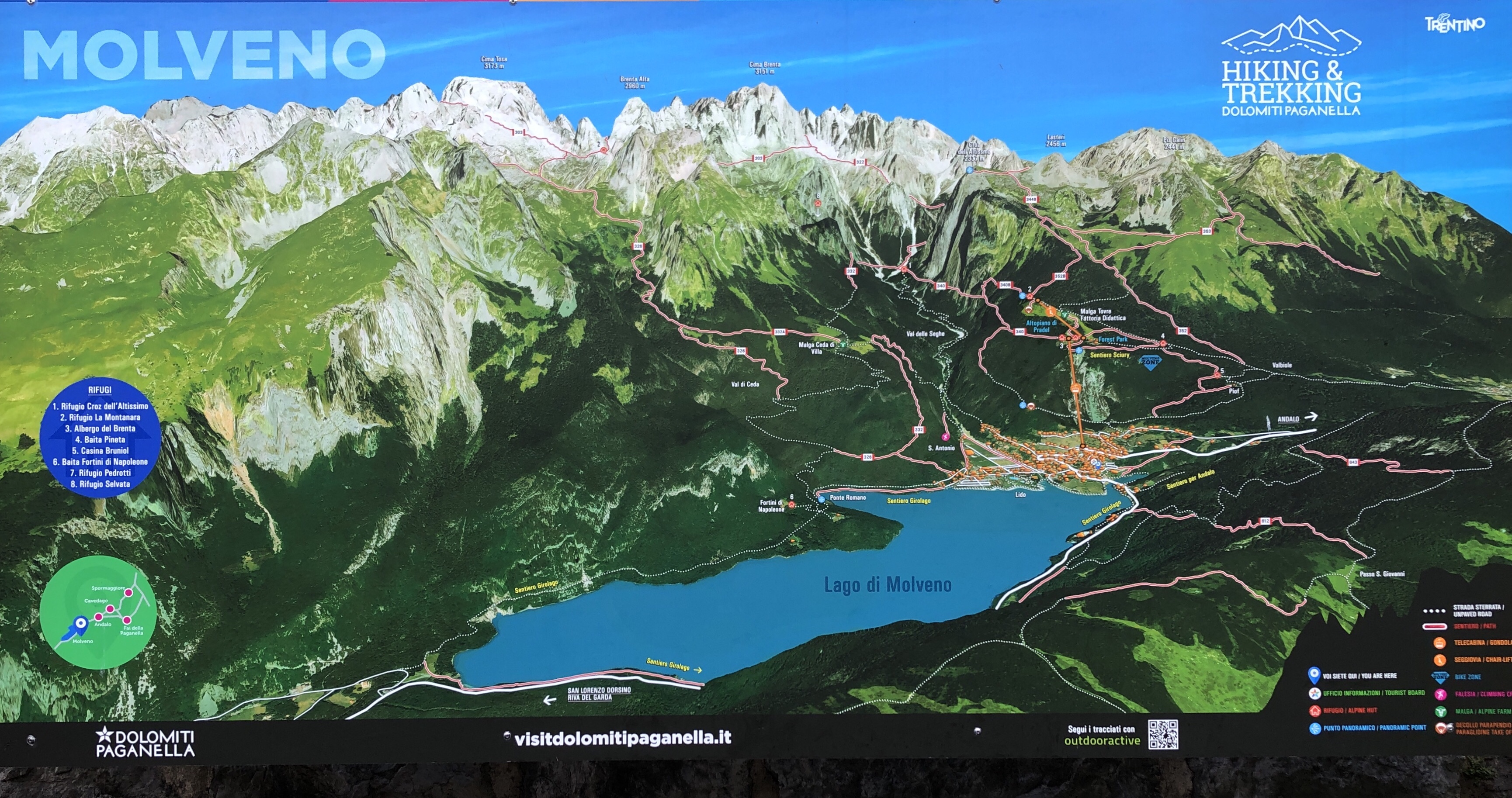 Am nächsten Hang ist Andolo zu sehen. Kurz dahinter soll lt. Karte eine Gaststätte und eine Pizzeria sein.