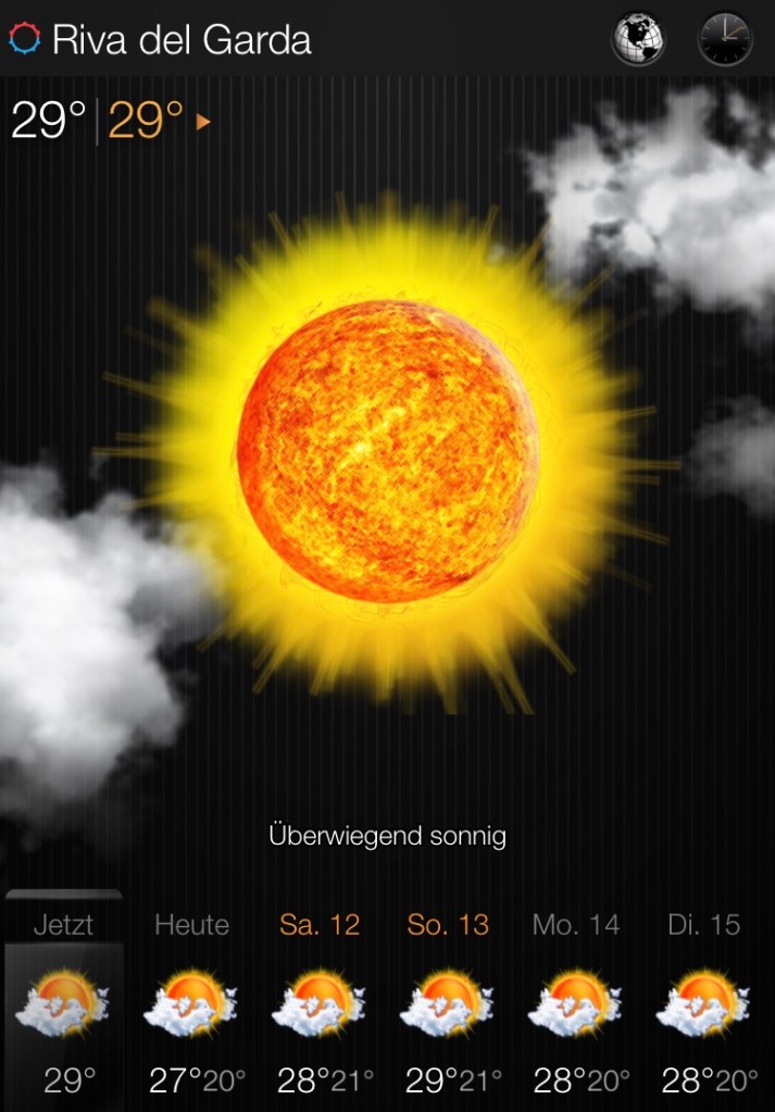 Ich denke, die Schuhe sind durch und haben sich den Ausstieg aus dem „aktiven Arbeitsleben“ dann mehr als verdient! Am Montag versuche ich dann mit dem Schiff runter zum südlichen Seeende zu gelangen. Nach Sirmione oder Peschiera möchte ich. (Vorher Schuhe kaufen!! Leichte!!!)
