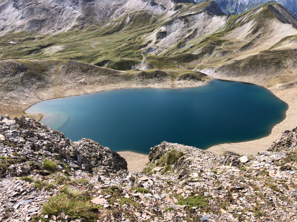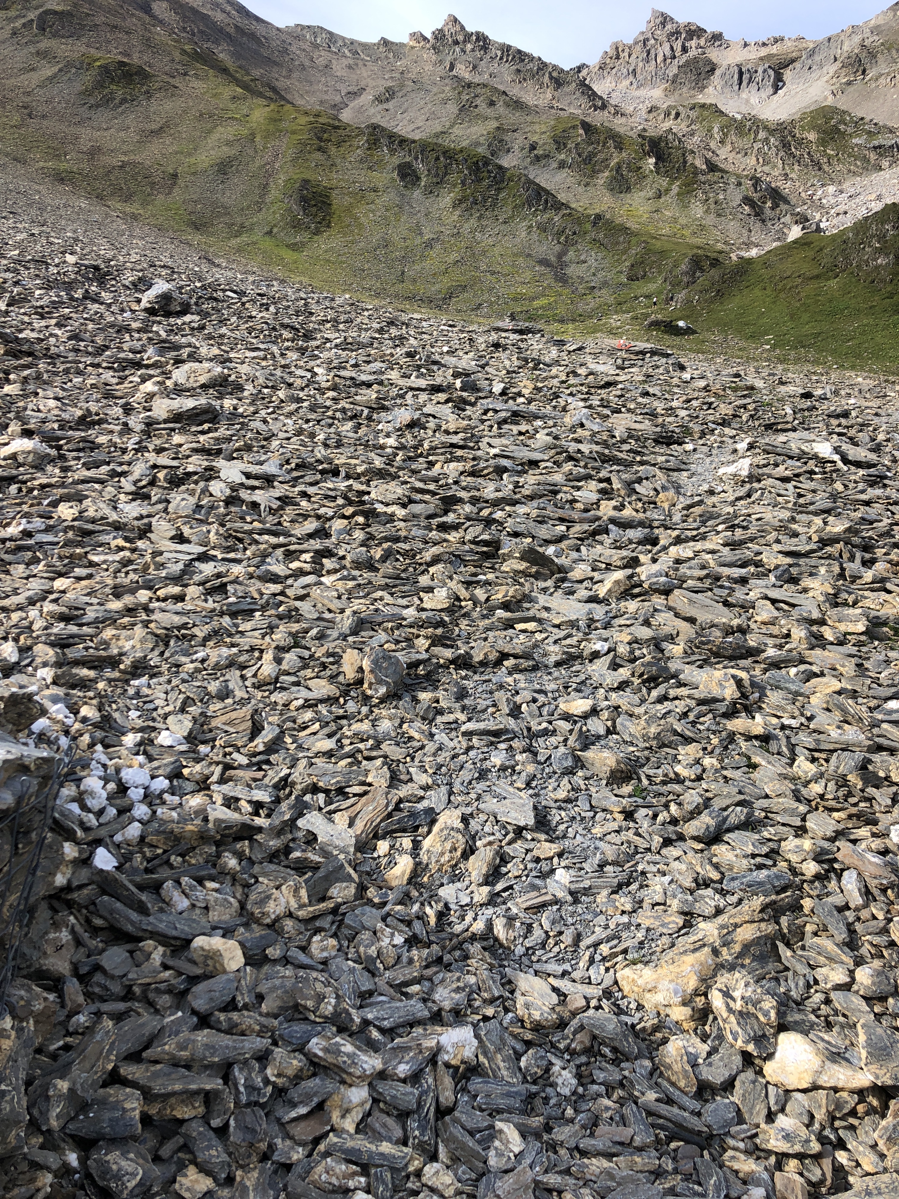 Zwischen steilen Felsen und Schiefergeröllfeldern versuche ich mich weiter vor zu tasten. Mehrfach überlege ich, ob ich nicht lieber umkehren sollte, und versuchen den Weg wieder zu finden. Aber dazu bin ich eigentlich schon zu weit und hab einige komplizierte und brenzlige Stellen hinter mir gelassen.🙈